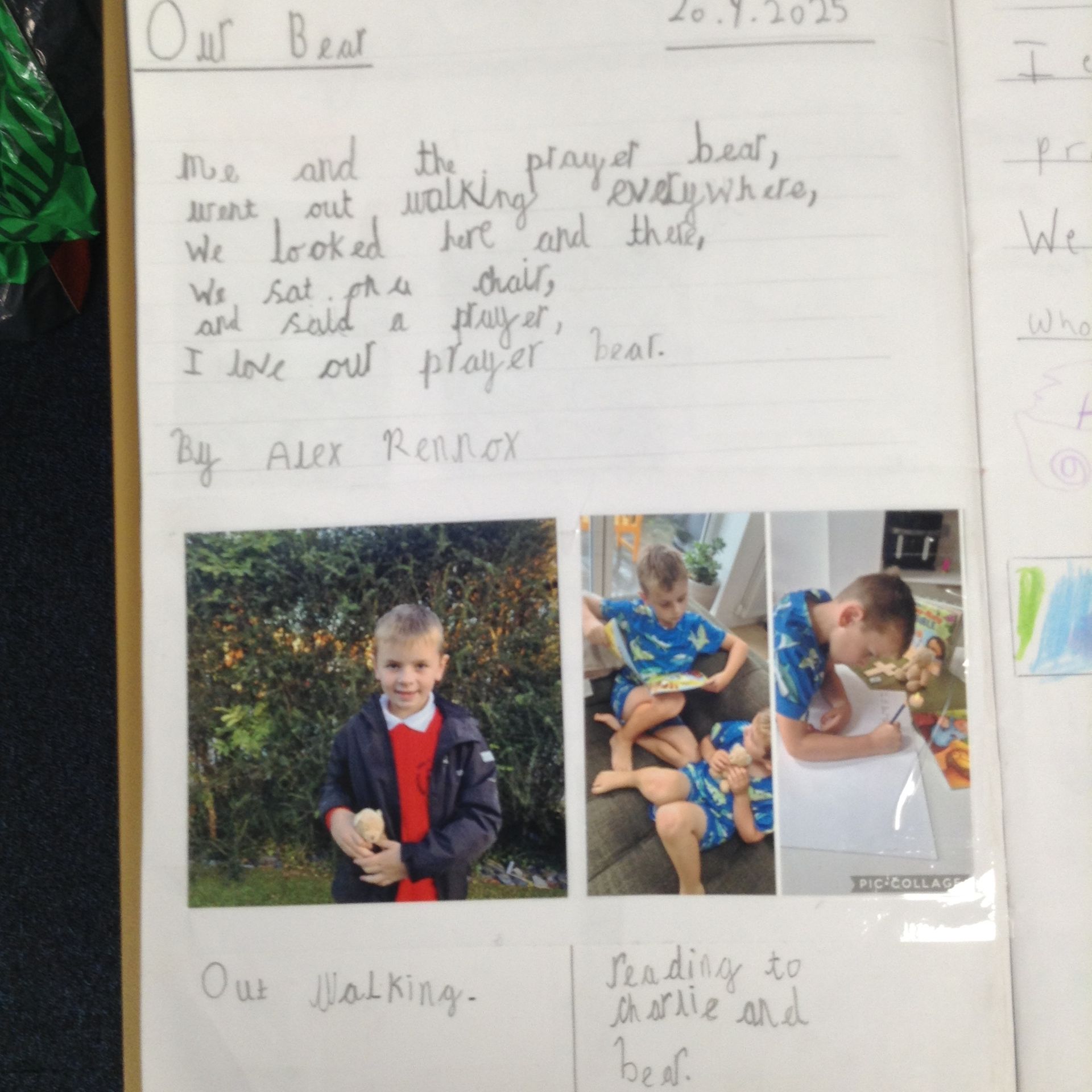 The children in KS1 have loved sharing their prayer and liturgy journey at home with their families and their prayer bear. Each week, the children take the prayer bear home, and their home worship is celebrated and shared in class. They enjoy bringing the experiences of school prayer into their homes, practicing reflection and prayer together, and talking about what they have learned. This helps to deepen their understanding of faith and strengthens the connection between home and school prayer life.